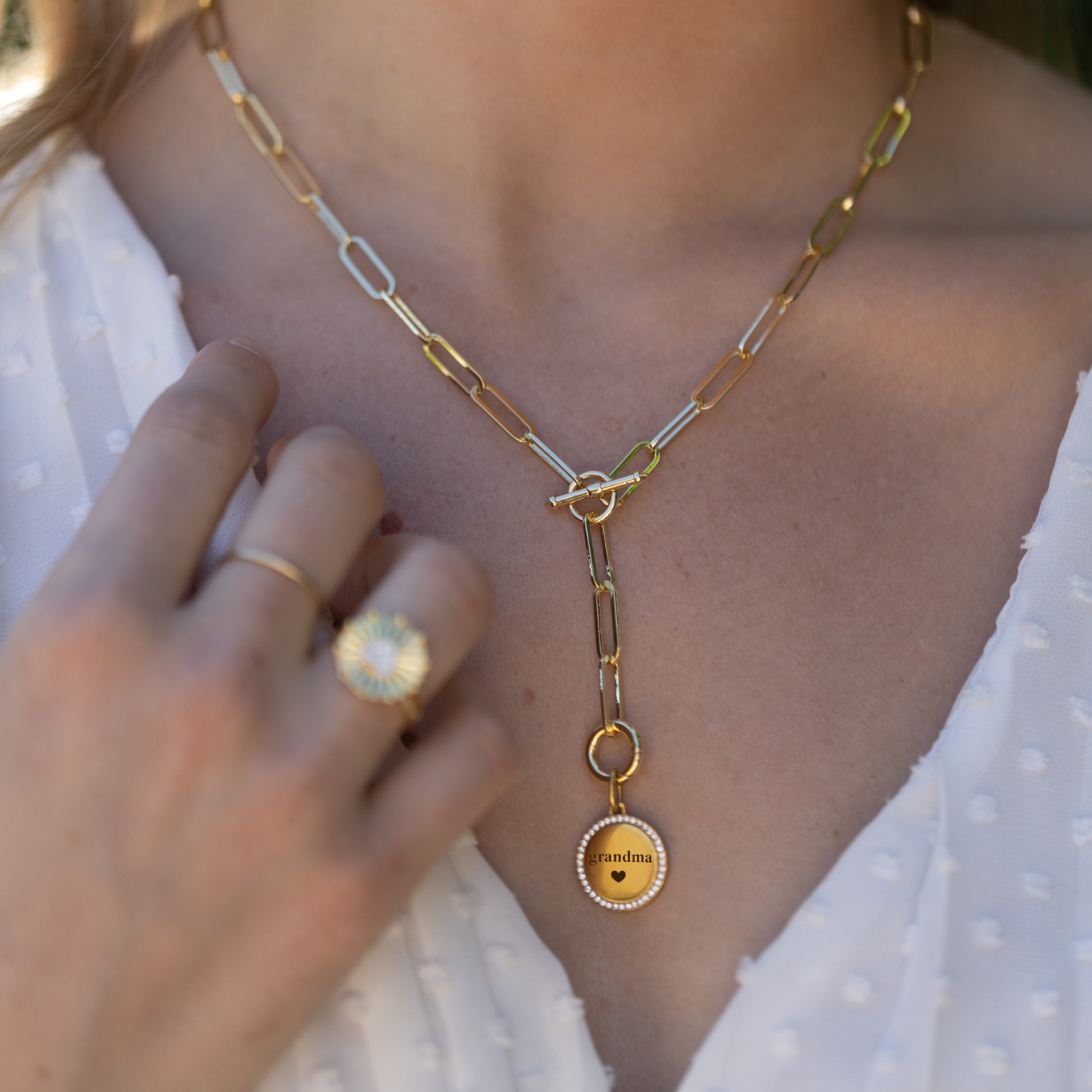 For the one who holds it all together. The Grandma Crystal Inscription Plate features a circular inscription framed with radiant crystals—creating a timeless, meaningful piece. Designed to be worn on a chain or added to a carabiner, it’s the perfect gift she’ll cherish every day.