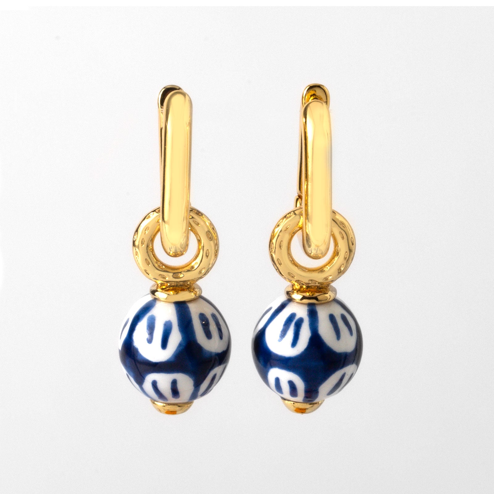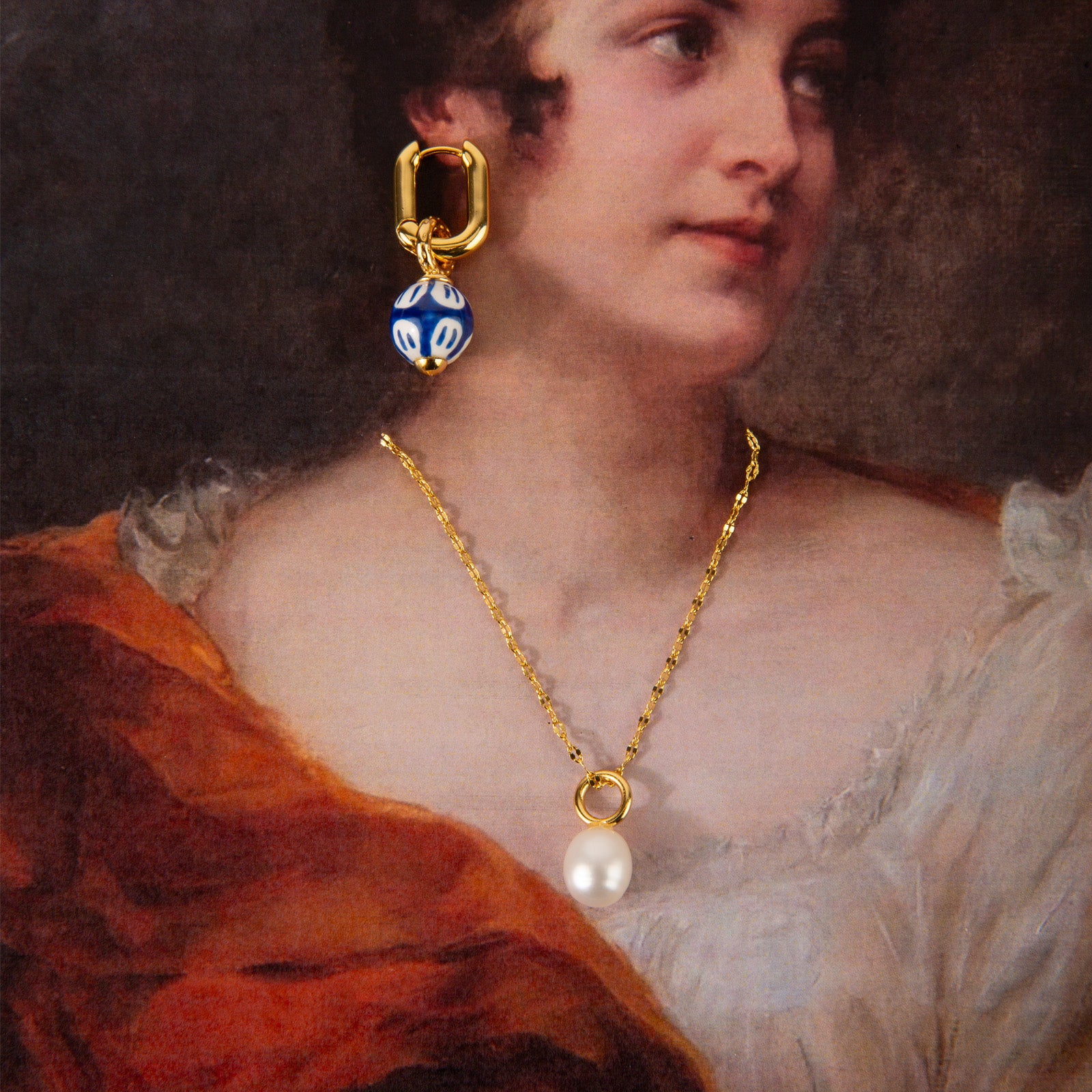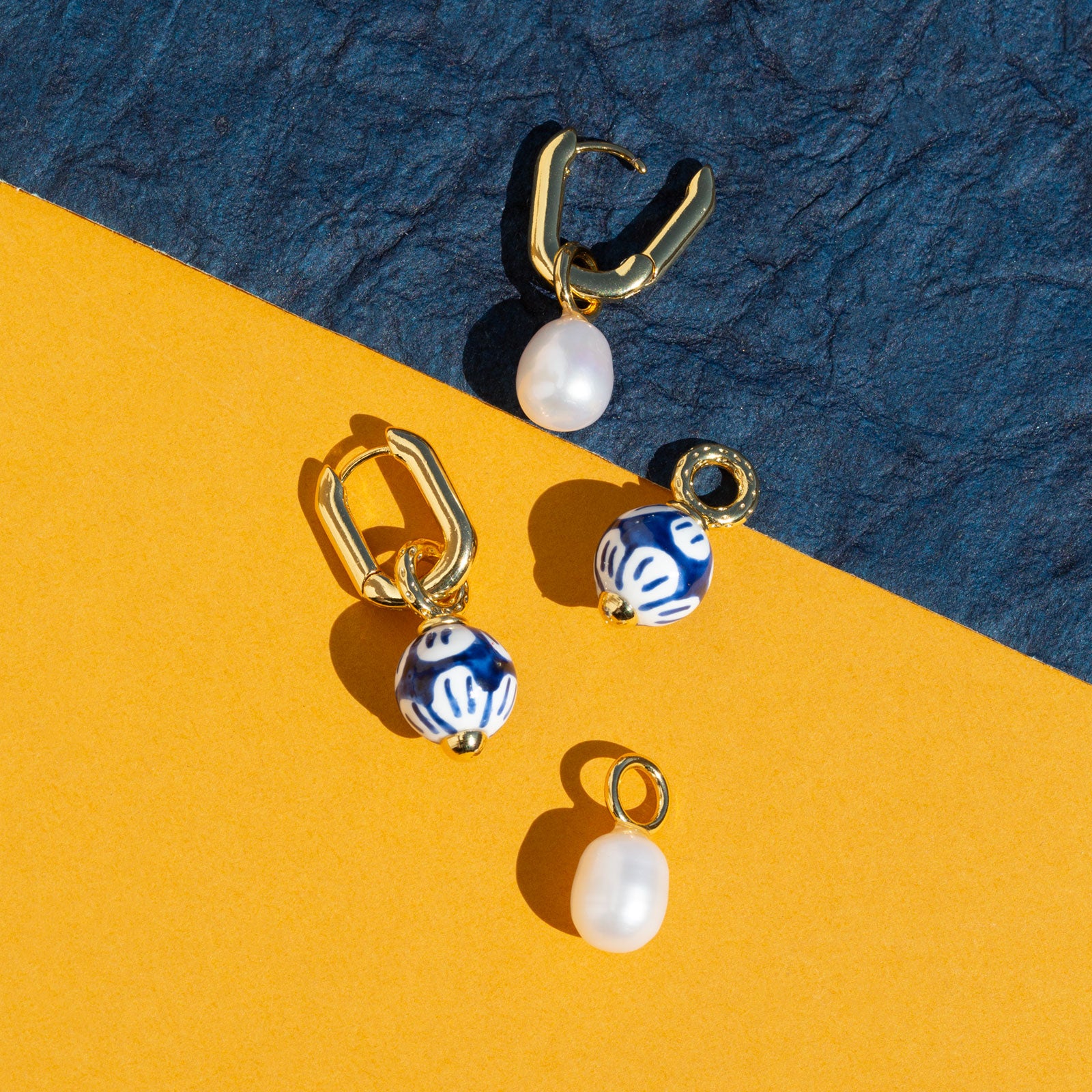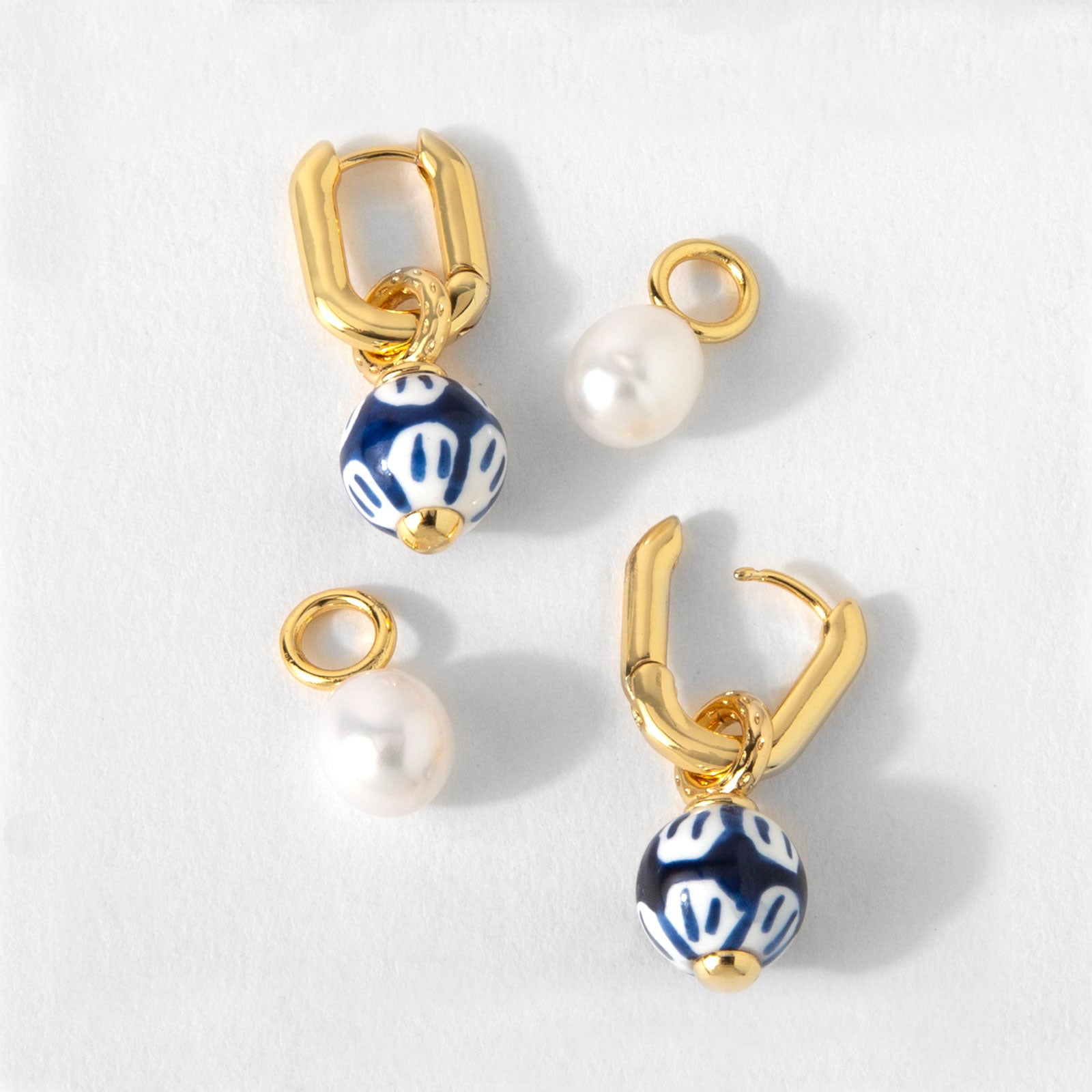 One pair, 2 styles, endless charm. The Pearl & Glaze Earring Set includes classic gold hoops and two interchangeable drop pendants—one with luminous freshwater pearls, and the other with painted blue porcelain-inspired beads. Swap them to suit your mood, your outfit, or the moment! From timeless elegance to playful polish, wear these earrings 2 different ways and let your style do the talking.