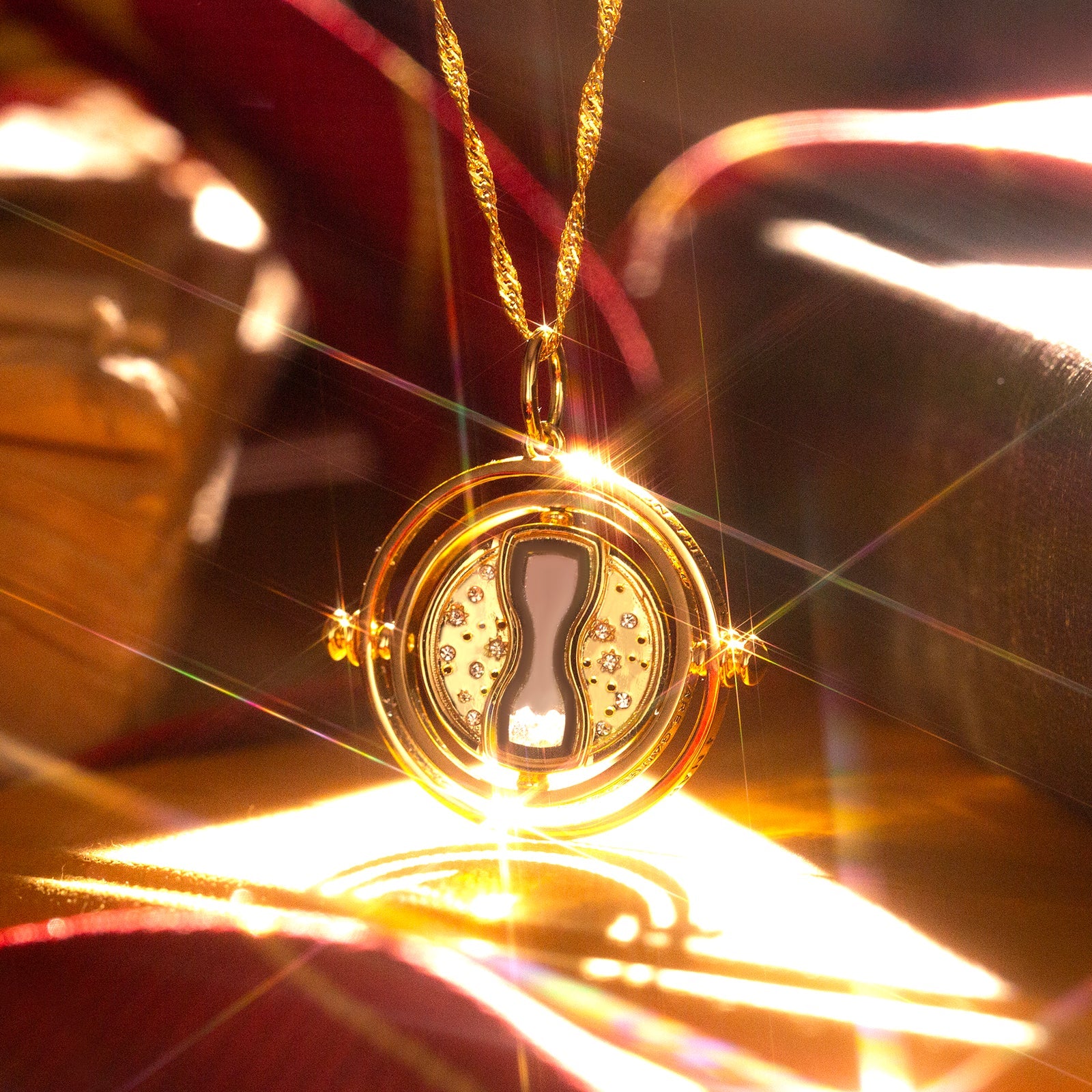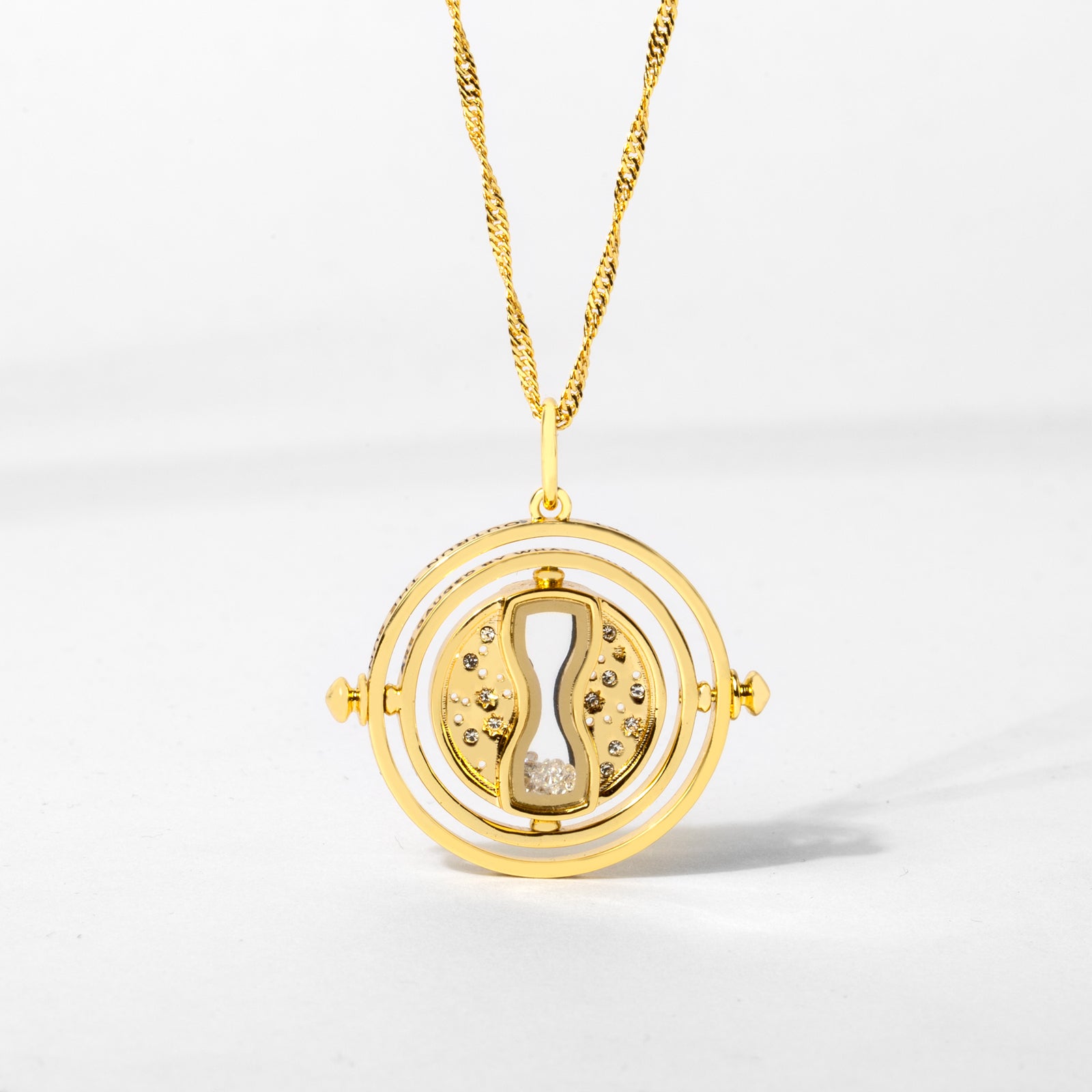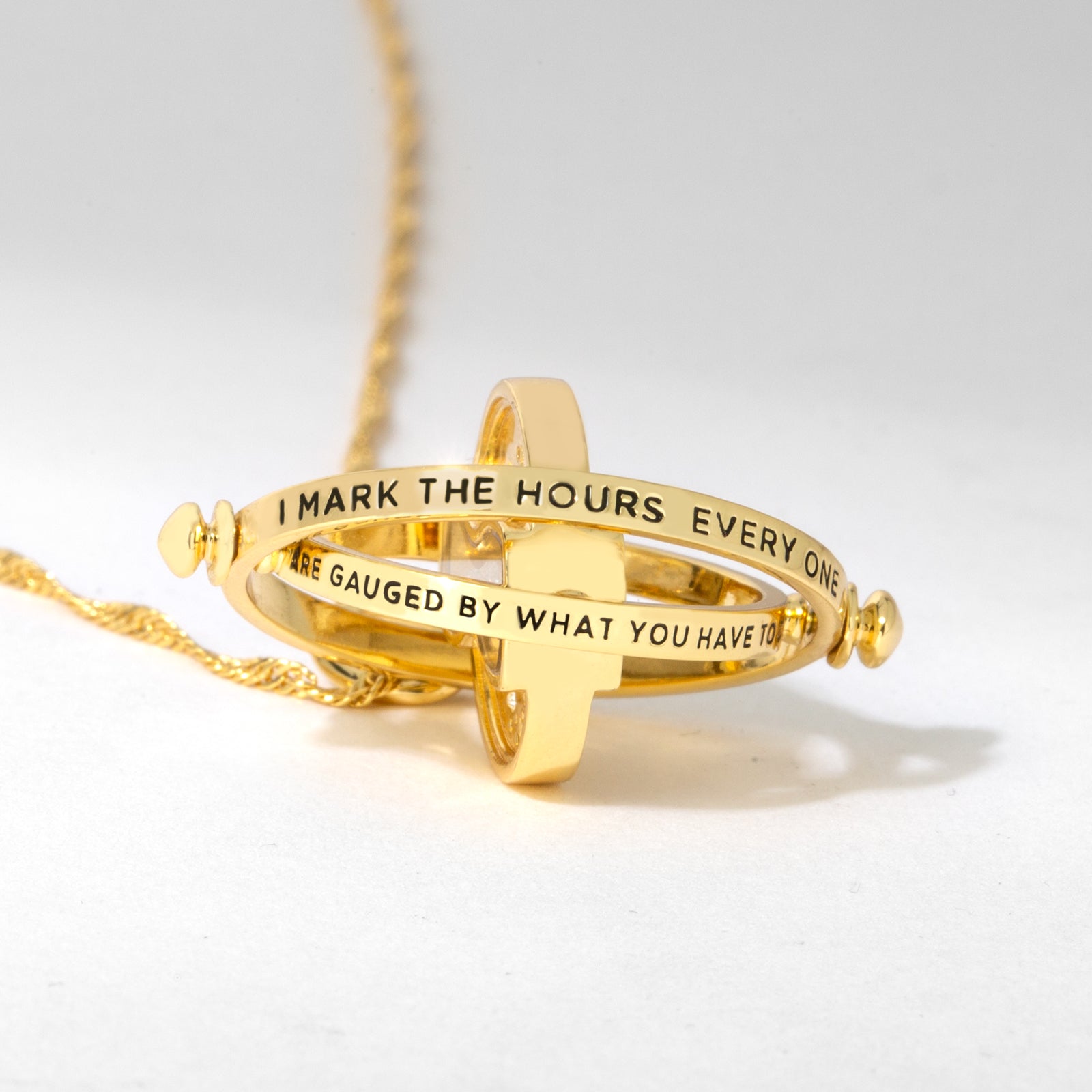 Get ready to turn back time and unleash the magic with our exquisite Harry Potter Time Turner Spinning Pendant Necklace! This enchanting necklace features a meticulously crafted golden time turner pendant that spins, taking you on a whimsical journey through the wizarding world. This necklace is delicately inscribed with “I mark the hours, every one, Nor have I yet outrun the Sun. My use and value, unto you, Are gauged by what you have to do” and is attached to a 22-24” Dainty Faceted Rope Chain.