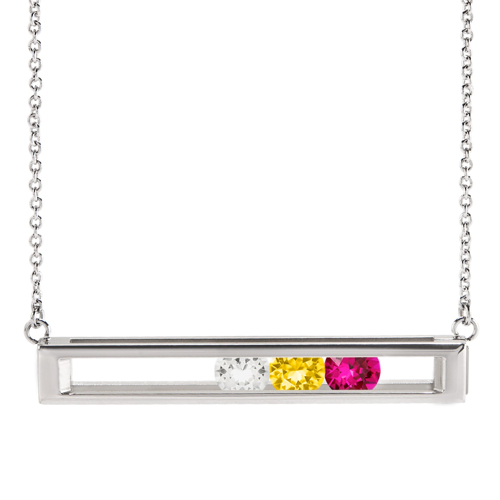 Keep your family and loved ones close to your heart with our Birthstone Bar Locket Necklace! Add up to seven Round Birthstone Crystals to tell the story of your children, family, friends, and loved ones, those who mean the world to you. Our Birthstone Bar Locket is a modern design that features an open cage (no glass!) that allows the Birthstones to move freely and showcase their brilliance. Simply open the hinged Locket, slide Crystal's point down, and snap it closed. The necklace chain is adjustable from 16-19".