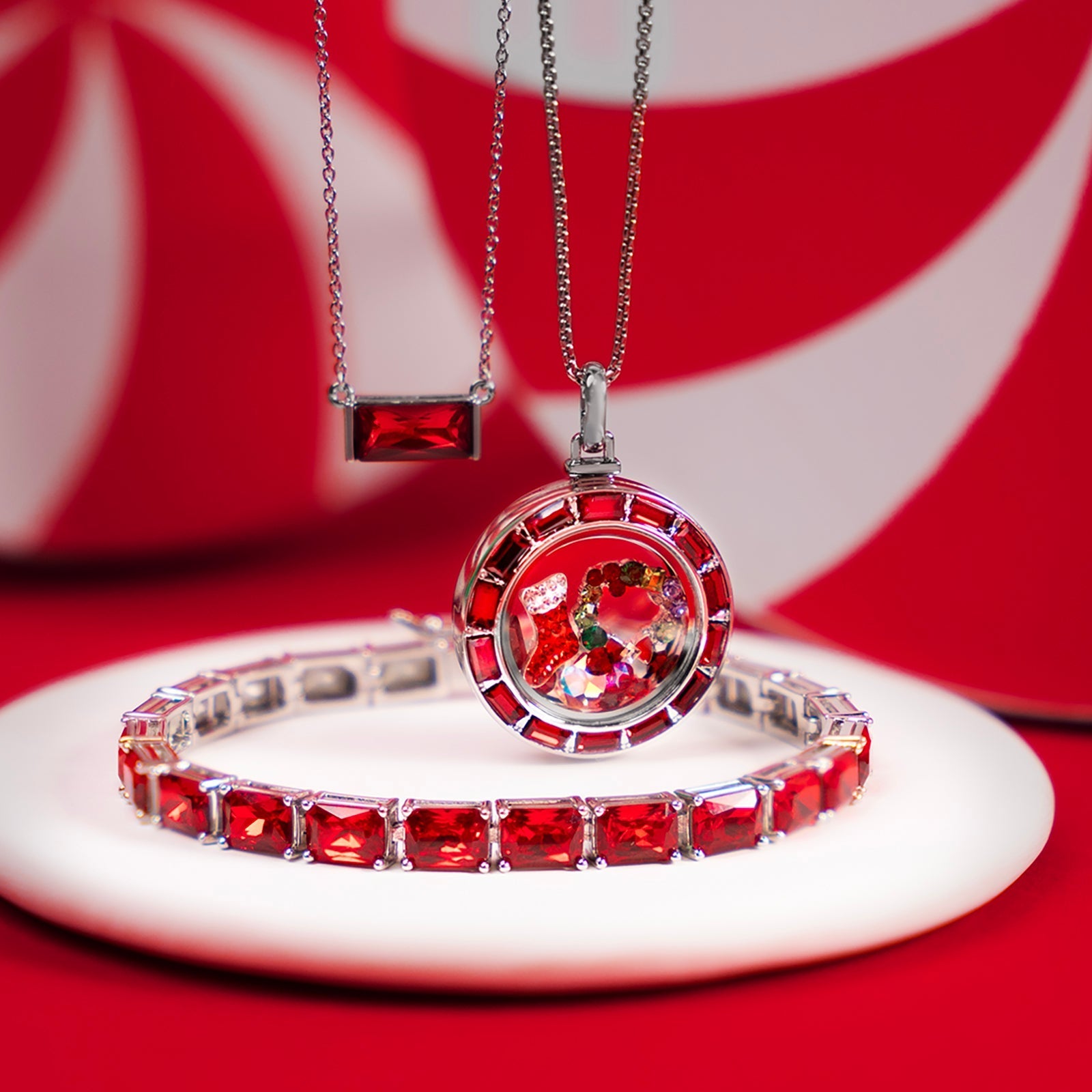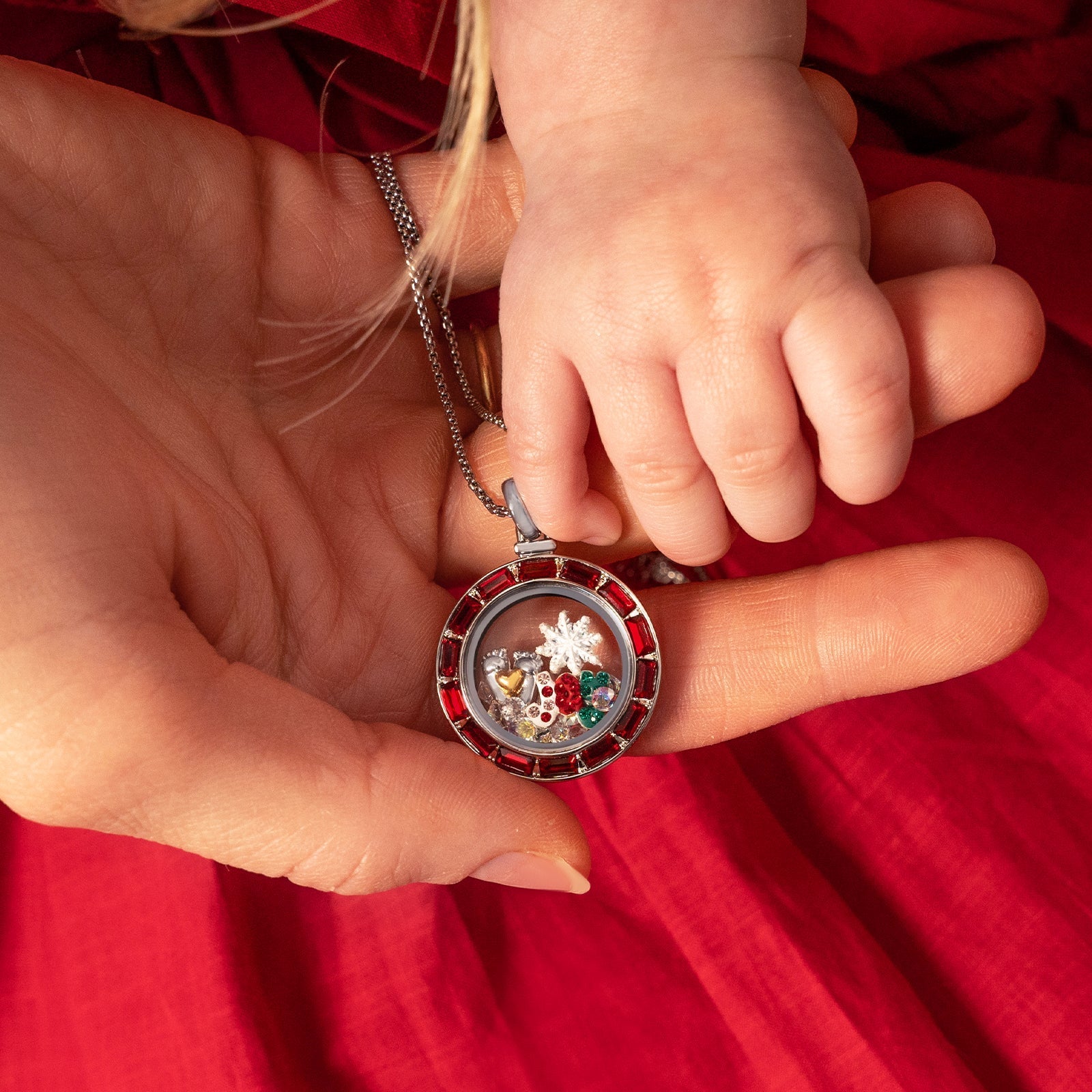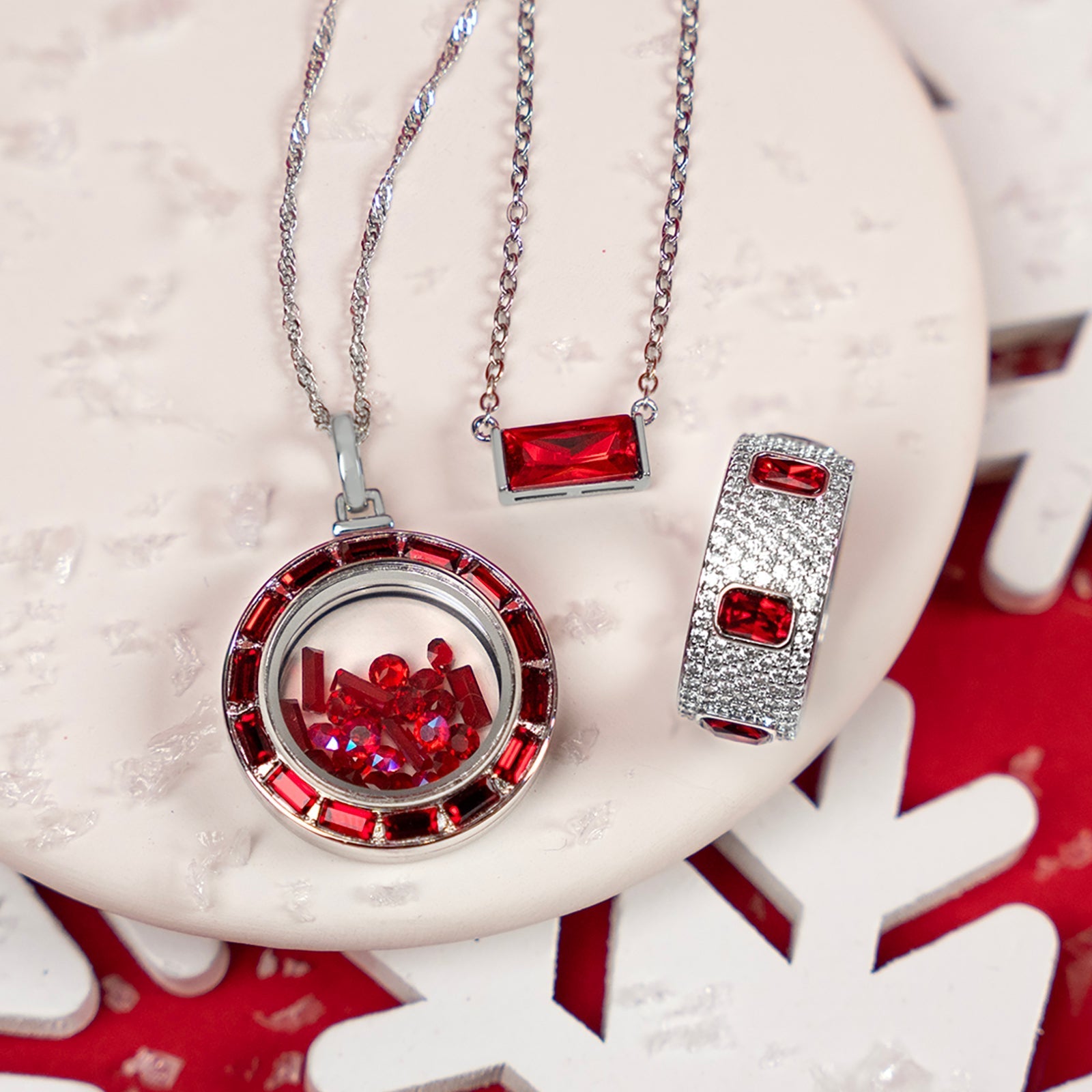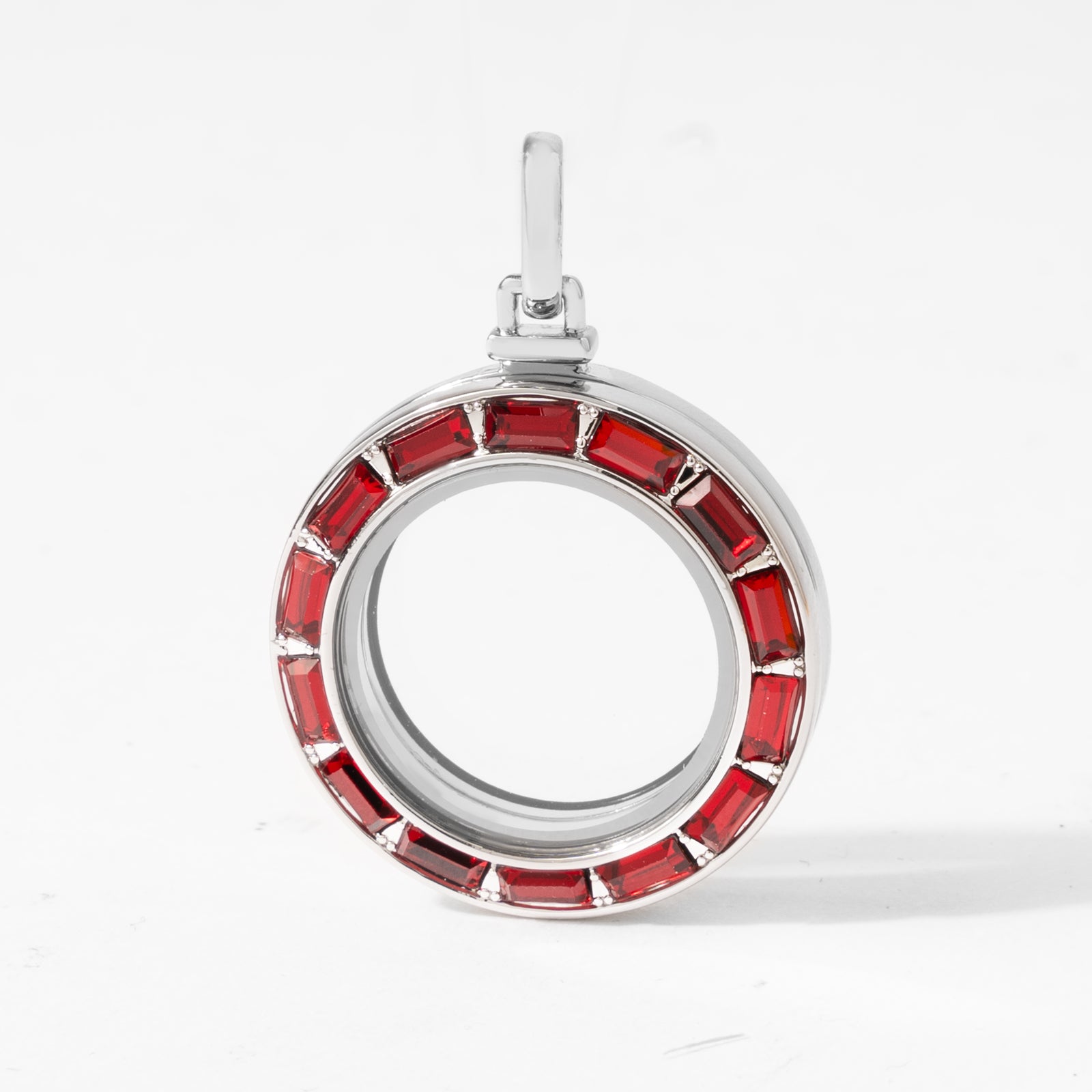 Tell your story in style with our Medium Siam Crystal Baguette Locket! This beautiful siam red hinge locket features dazzling baguette crystals and is designed to make your collection shine with elegance. Simply add your favorite chain and floating charms to create a look that is as unique as you are.