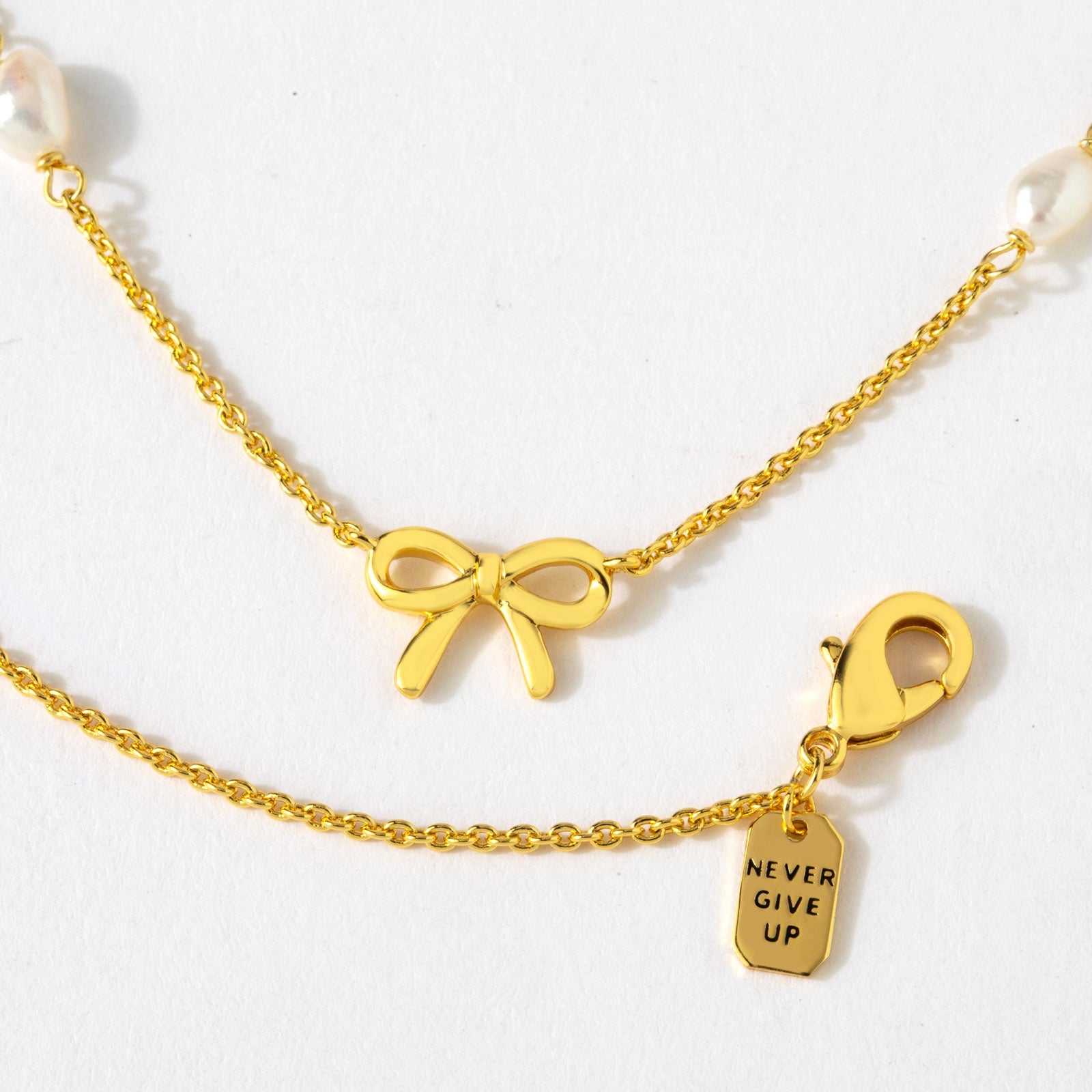 A keepsake for all ages! Celebrate the special bond with our Mama and Me Pearl + Bow Necklace. Featuring freshwater pearls and the phrase "Better Together" on the bow, this 16-19" pearl necklace is a perfect way to share style and sentiment between mom and child. Perfect for the holiday season, this piece adds a touch of grace and unity to every mother-daughter duo.