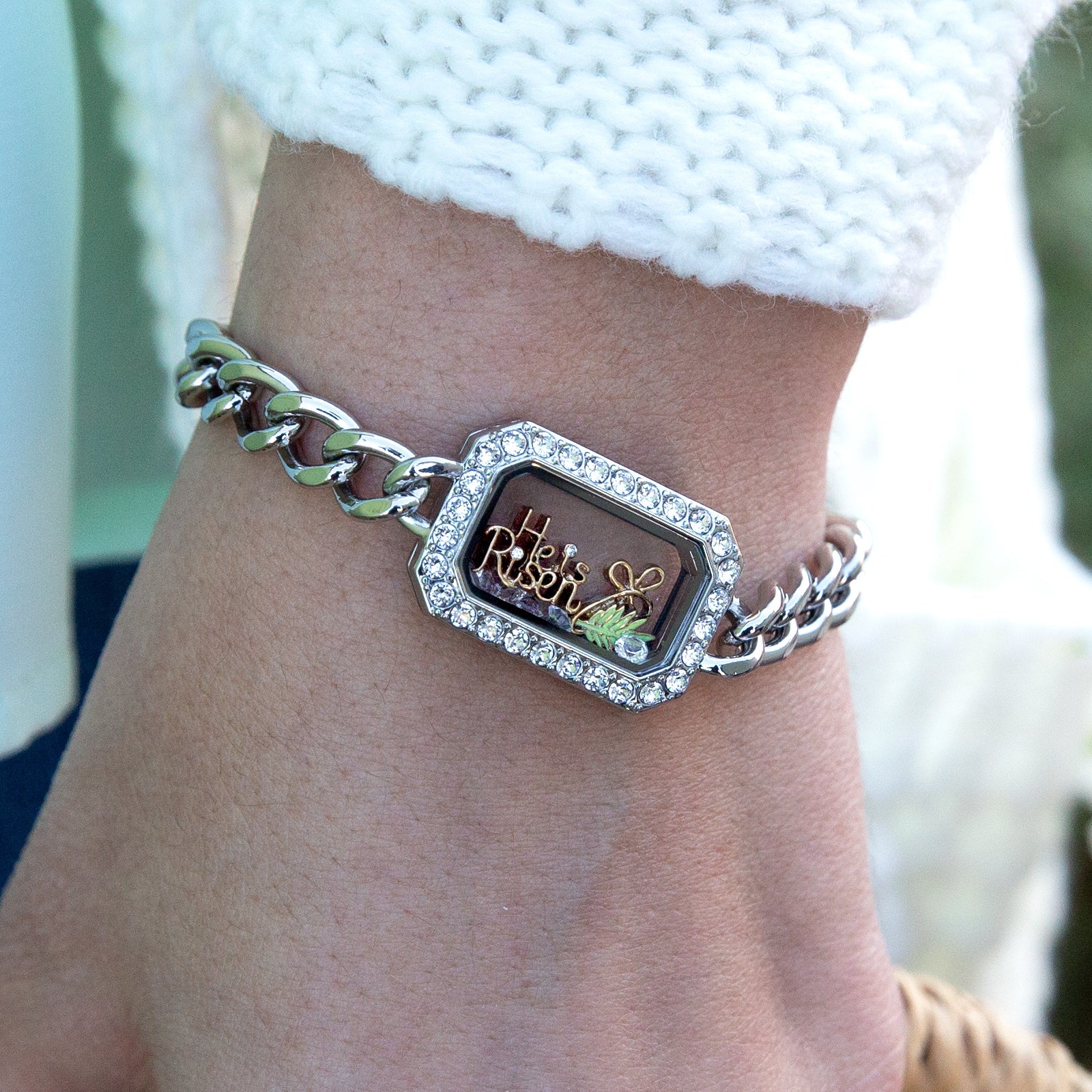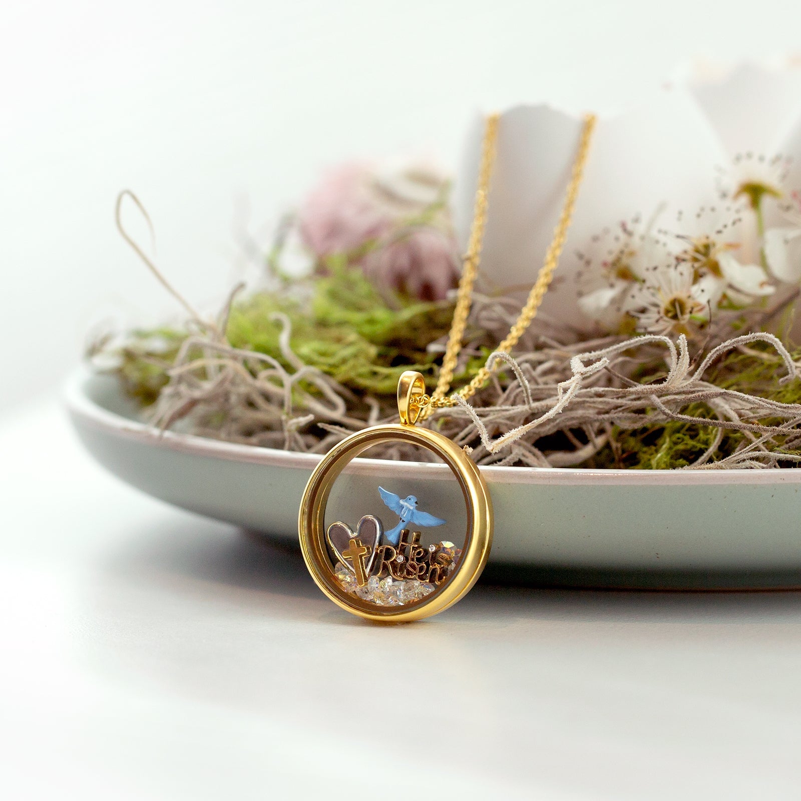"He is not here; he has risen!" – Matthew 28:6. Celebrate the resurrection of Jesus Christ by adding this Gold “He is Risen” Charm, featuring two crystals, to your Living Locket®.