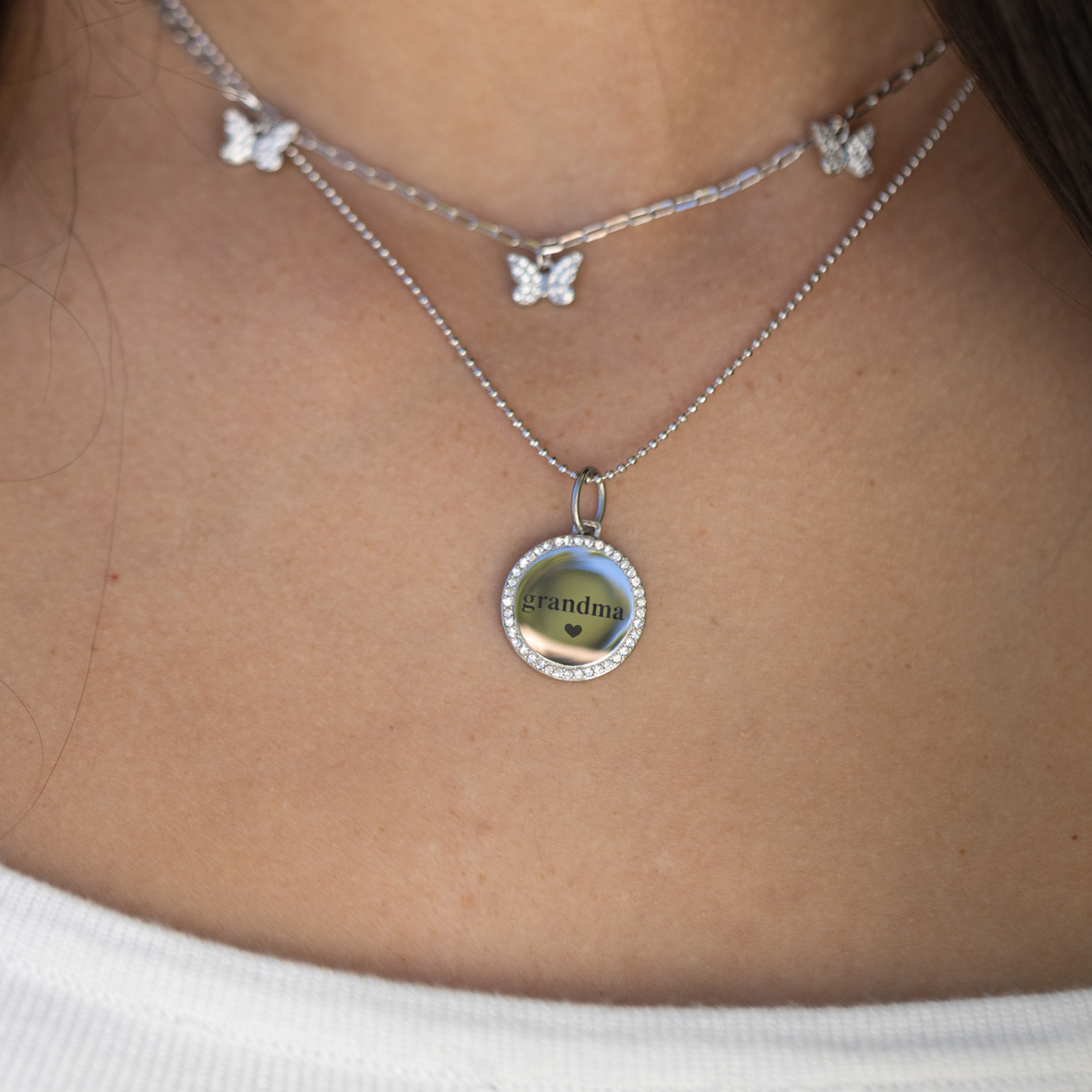 For the one who holds it all together. The Grandma Crystal Inscription Plate features a circular inscription framed with radiant crystals—creating a timeless, meaningful piece. Designed to be worn on a chain or added to a carabiner, it’s the perfect gift she’ll cherish every day.
