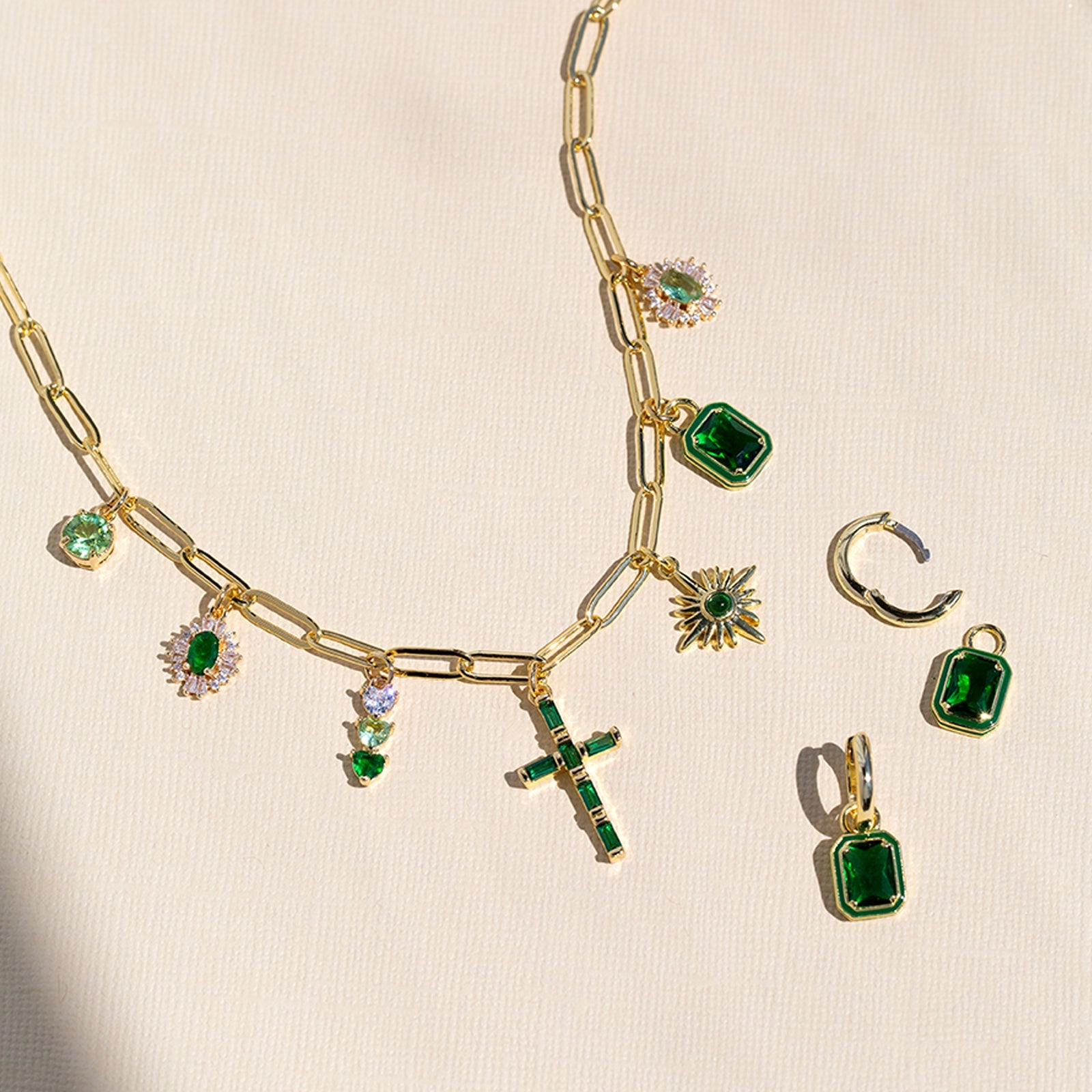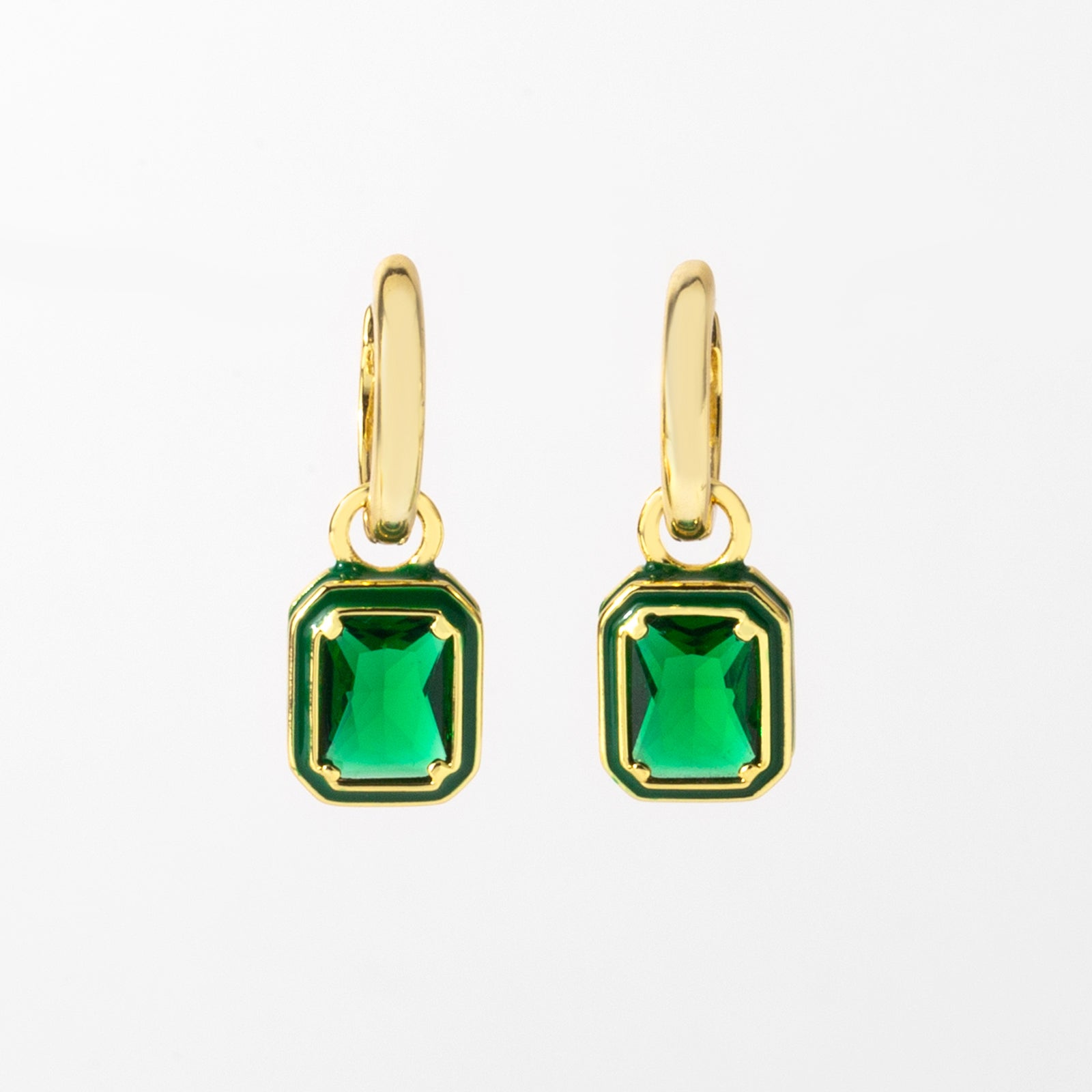 Additionally, these convertible drop earrings can be worn in two different ways! Create a more casual look by wearing them just as hoops or wear them with the emerald crystals for a more luxurious vibe.