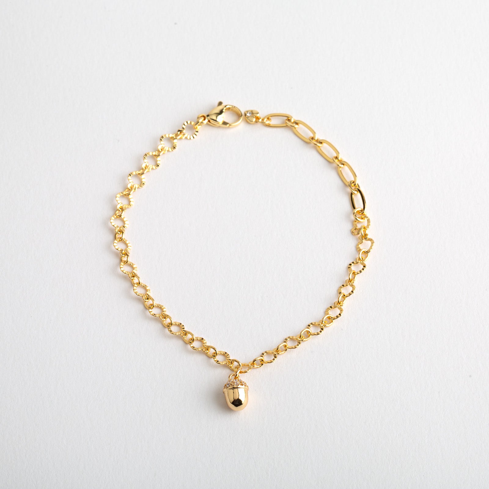 The Autumn Oak Charm Bracelet brings a seasonal twist to classic charm styling! Featuring a tiny acorn charm on a dainty faceted heart chain, this 6.5-8" fall bracelet is playful, polished, and a thoughtful accent for any fall outfit.