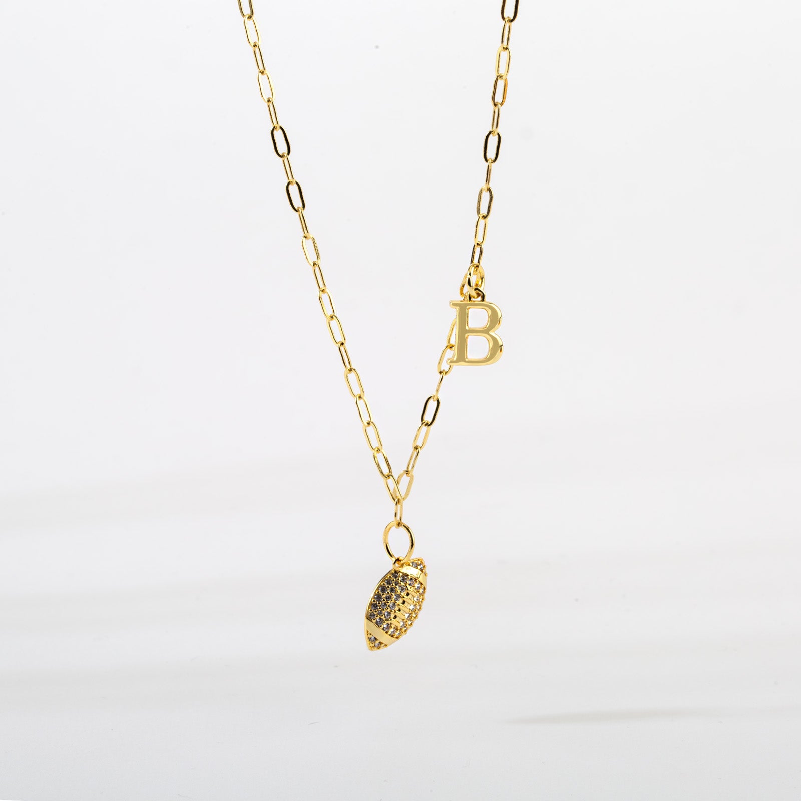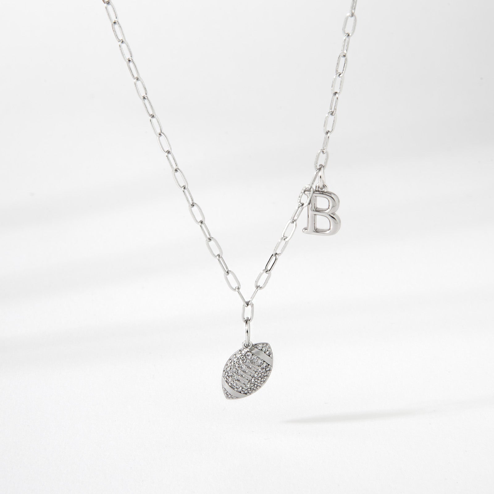 Bring sparkle to the gridiron with the End Zone Football Necklace! Create your new favorite Game Day jewelry and take your team pride with you wherever you are! Personalize this 17-19" football necklace with the initial that represents your team, your favorite player, or for someone special for you. Whether you’re cheering from the stands or celebrating a big win, this personalized football charm pendant necklace is a stylish way to keep your team spirit alive.