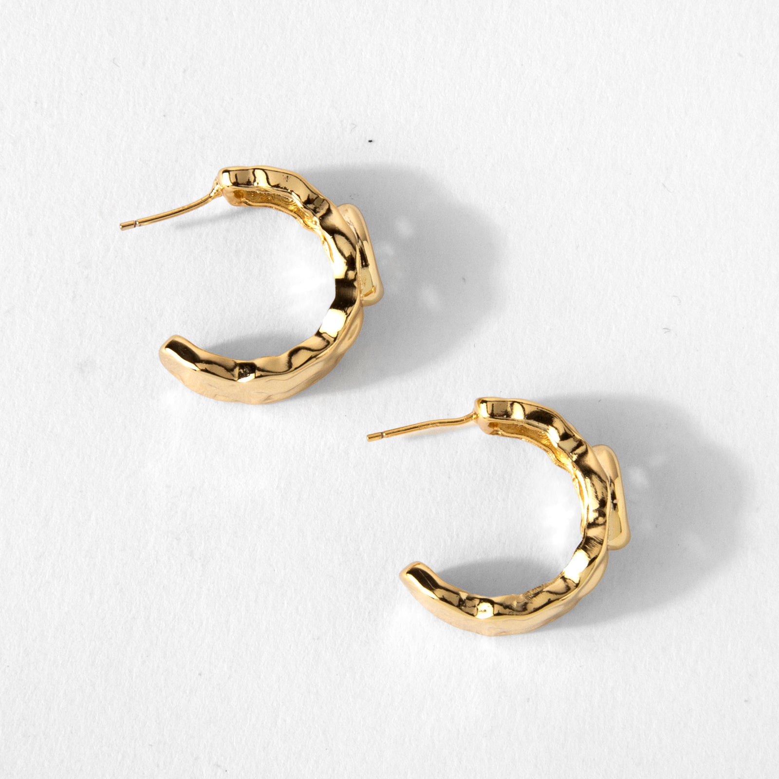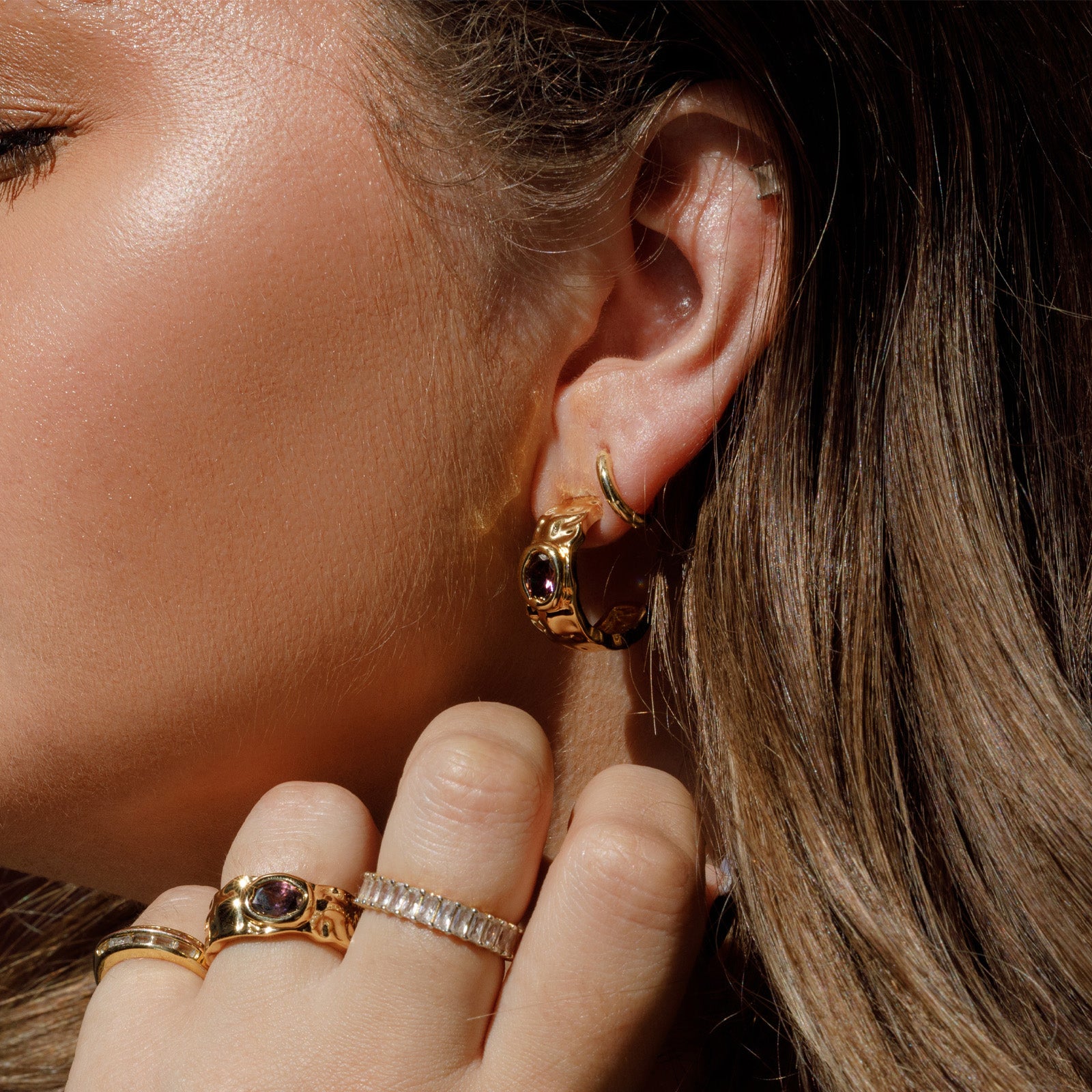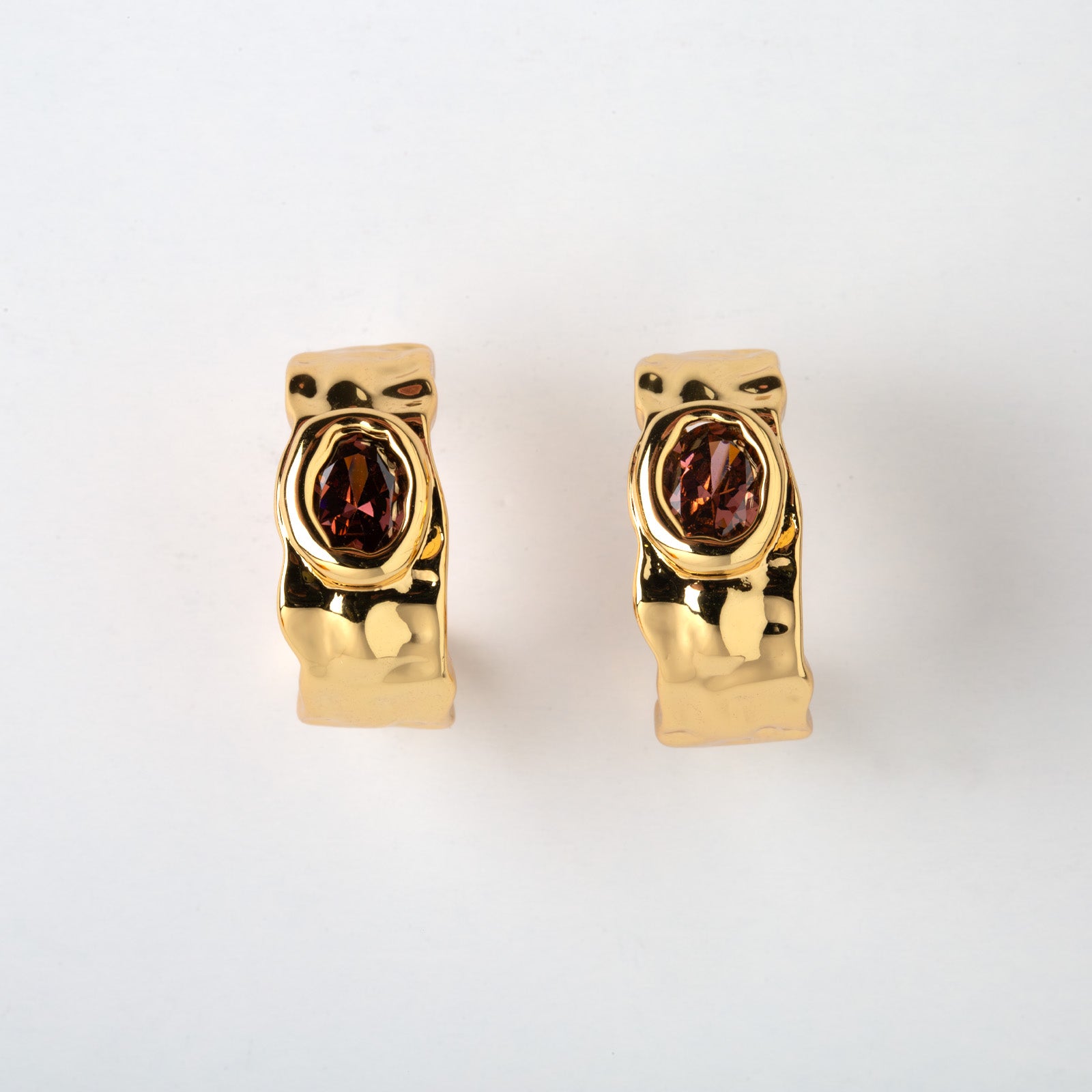 The Harvest Gem Hoops bring a bold, organic silhouette and gemstone sparkle to your seasonal wardrobe. Designed with a rich rhodolite crystal, these gold hoop earrings are perfect for dressing up denim or adding drama to an evening look.