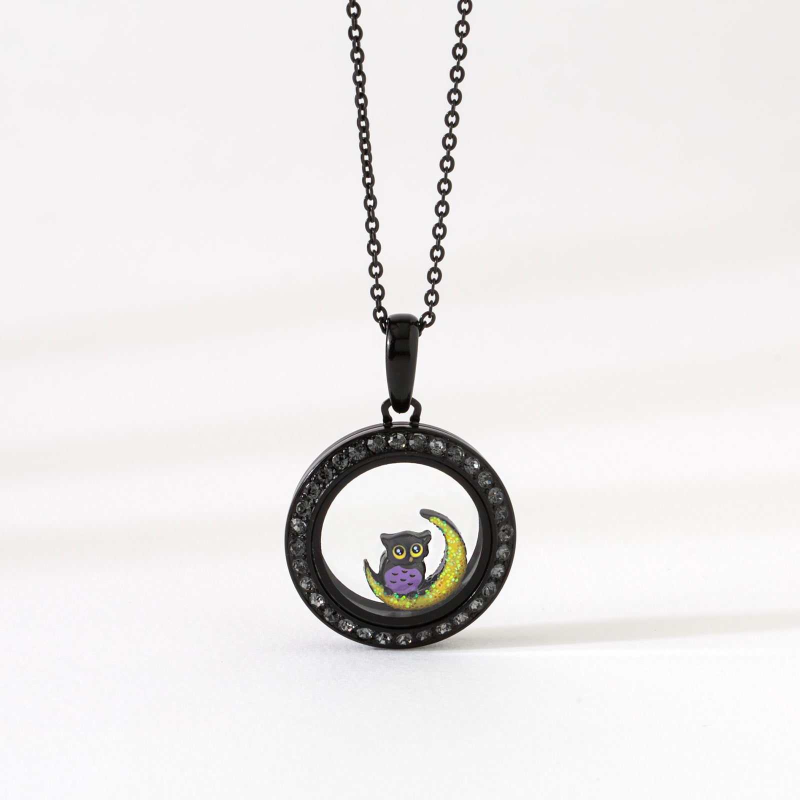 The Twilight Owl Locket brings a little nighttime magic to your Halloween jewelry style. This 16–18" black locket necklace features a tiny owl charm perched under a glowing full moon & surrounded by sparkling crystals. This owl locket necklace is the perfect jewelry for owl lovers, moonlight dreamers, or anyone who loves cozy fall nights. Wear it on its own or layer it with your favorite necklaces for a look that feels magical and meaningful.