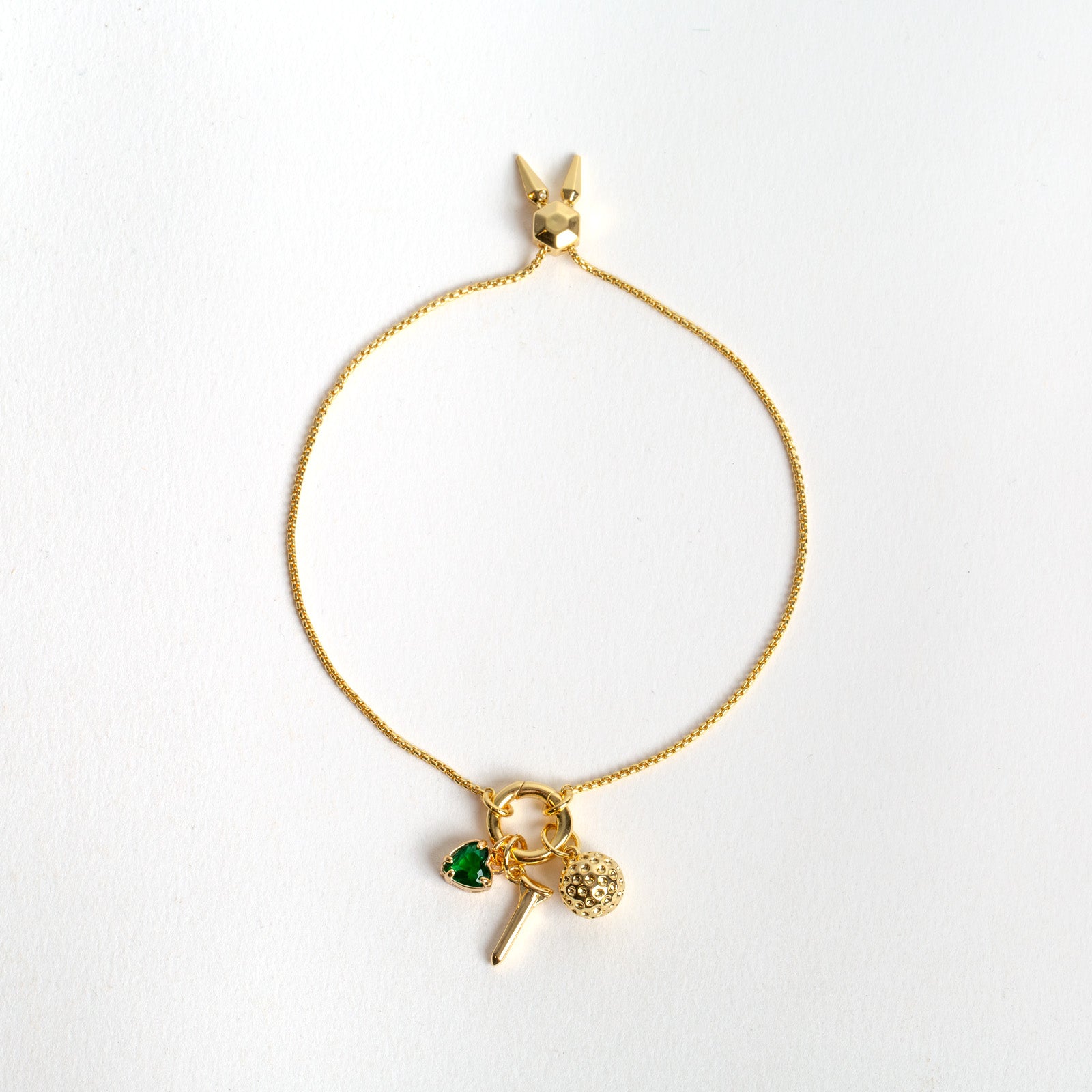 Show your love of the game with our Birdie Bolo Charm Bracelet. This gold bolo bracelet features a golf ball charm pendant, a golf tee charm pendant, and an emerald green heart pendant on adjustable bolo charm bracelet. Adjust the slider for the perfect fit and wear it from the clubhouse to the green. This golf bolo bracelet is sporty, stylish, and made for golf fans who want to parlay in style!