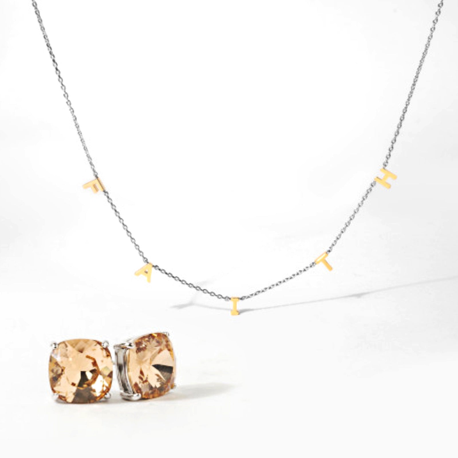 Our Faith + Golden Shadow Earrings Jewelry Set combines classic elegance with inspiring faith. This set includes a silver "FAITH" Necklace that’s adjustable from 16 to 19 inches, paired with our Golden Shadow Crystal Clara Stud Earrings. Let jewelry set be a reminder of strength and faith in every step.