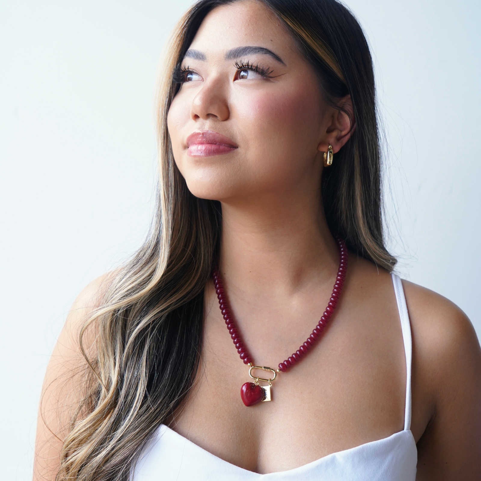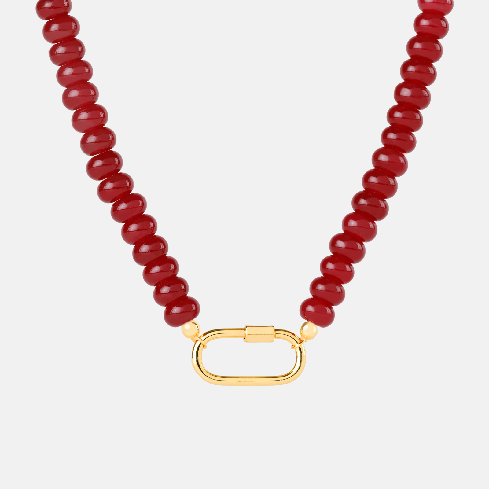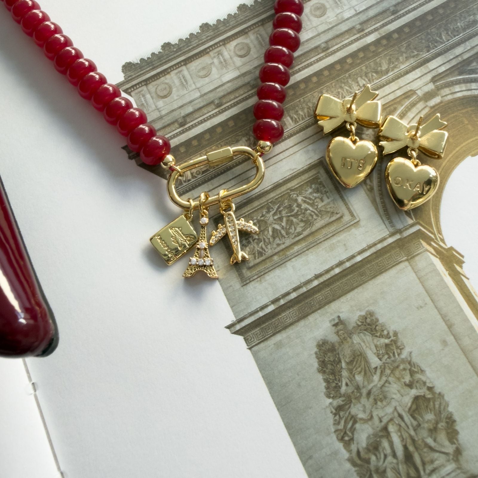 Our Parisian Rouge Carabiner Necklace blends a deep ruby-red jade accent with a sleek, polished clasp that feels unmistakably Parisian. Bold yet effortlessly elegant, it brings a romantic pop of color to any charm stack or layered look—making it the perfect statement piece for those who love a touch of Parisian flair.